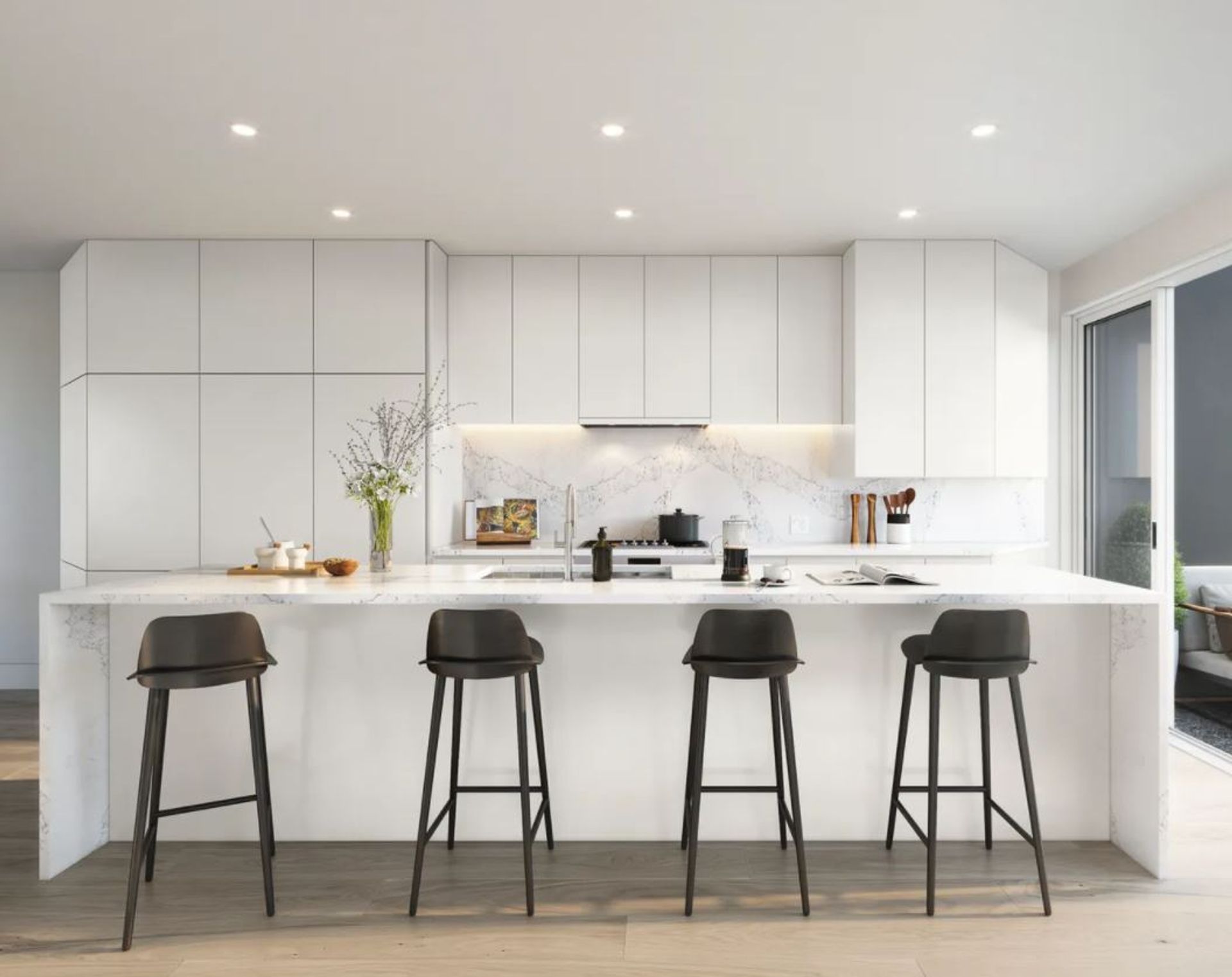 Oversize quartz countertops and backsplashes accent the kitchens and baths, while engineered White Oak wide plank hardwood flooring spans the main areas of the homes.