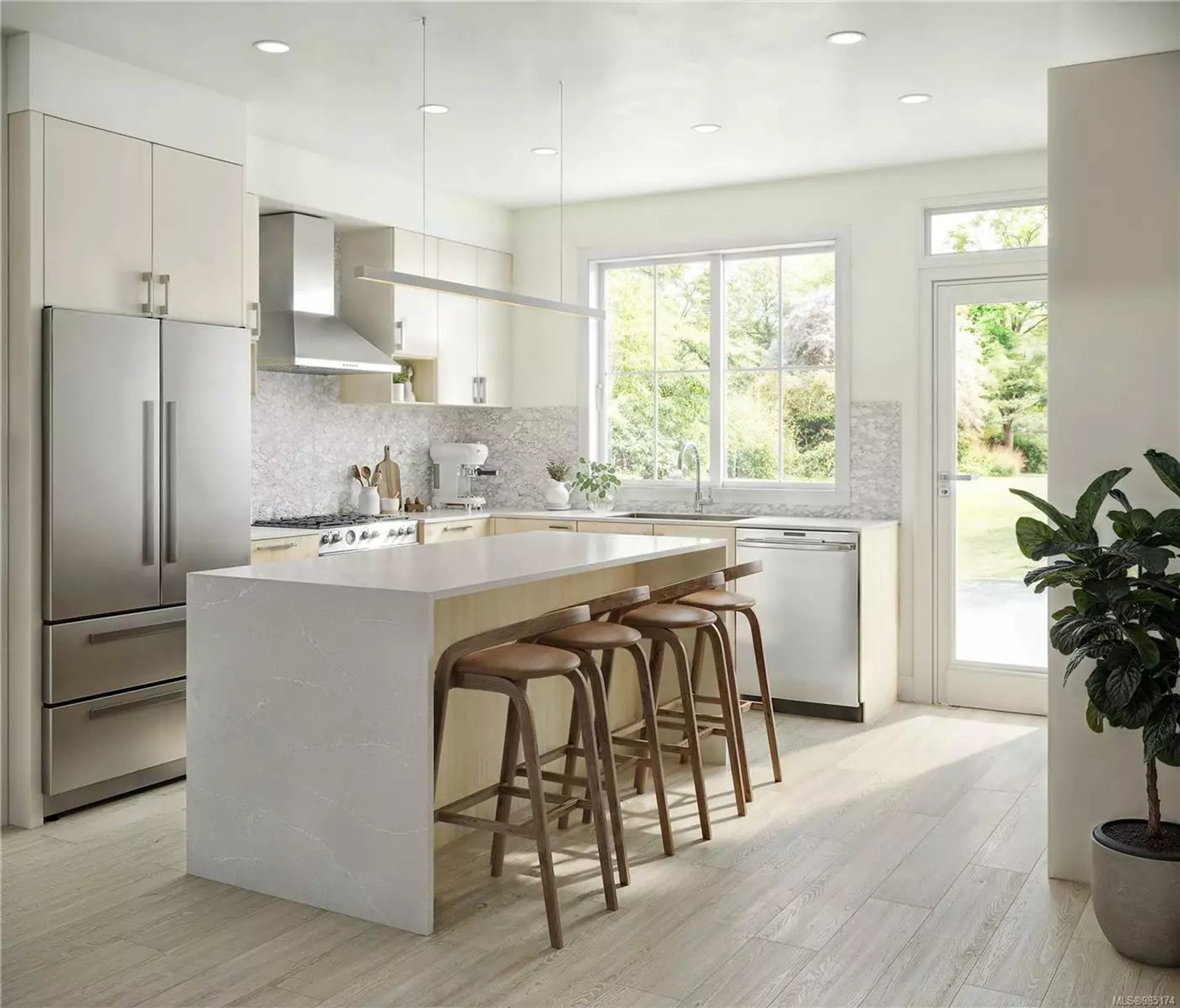 Inside, the interiors are bright and welcoming thanks to generous windows and 9′ ceilings. Kitchens are designed with both style and utility in mind: expect Bertazzoni stainless steel appliances, two-tone flat-panel cabinetry, a built-in full-height pantry, and sleek quartz countertops, some with elegant waterfall islands or peninsulas.