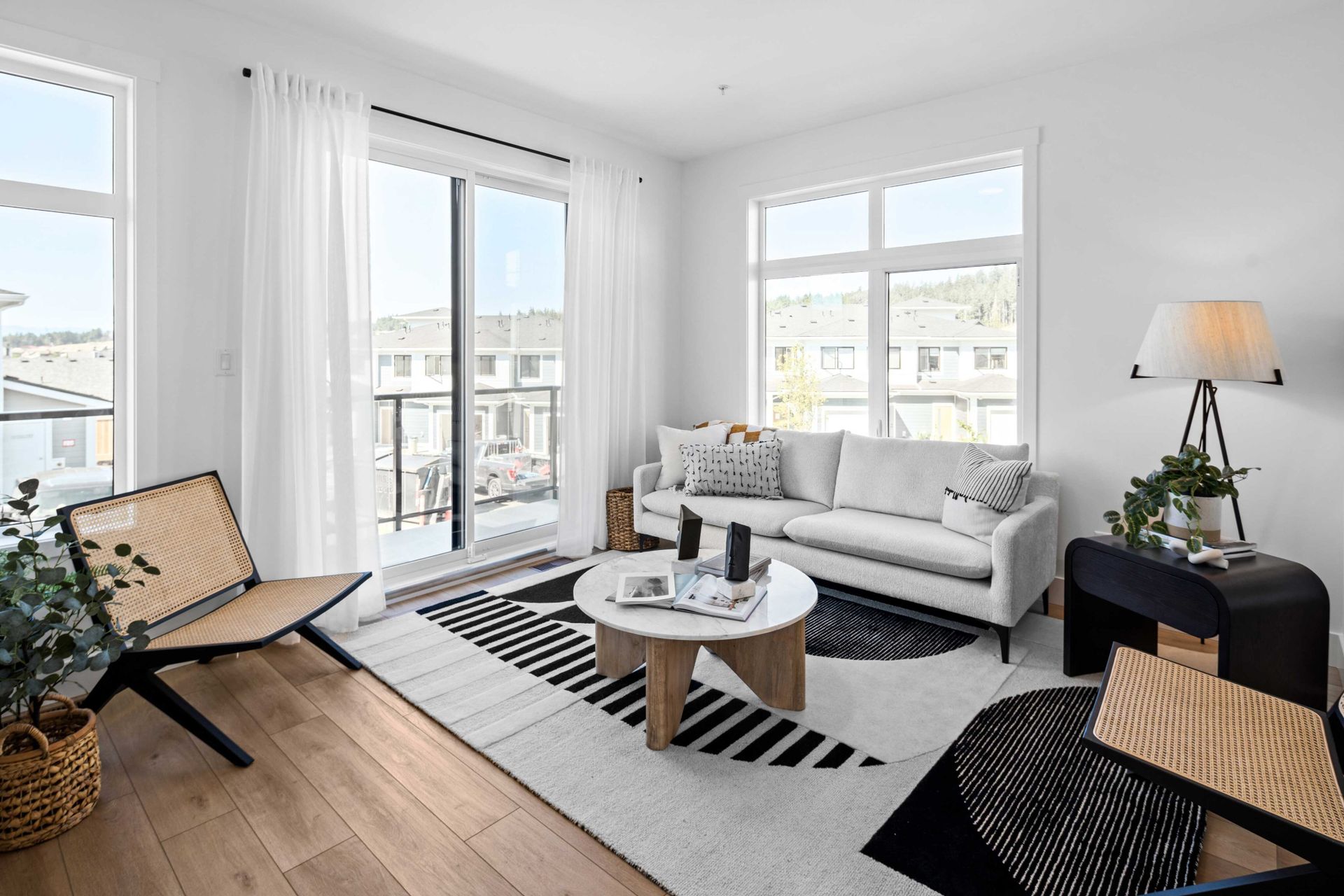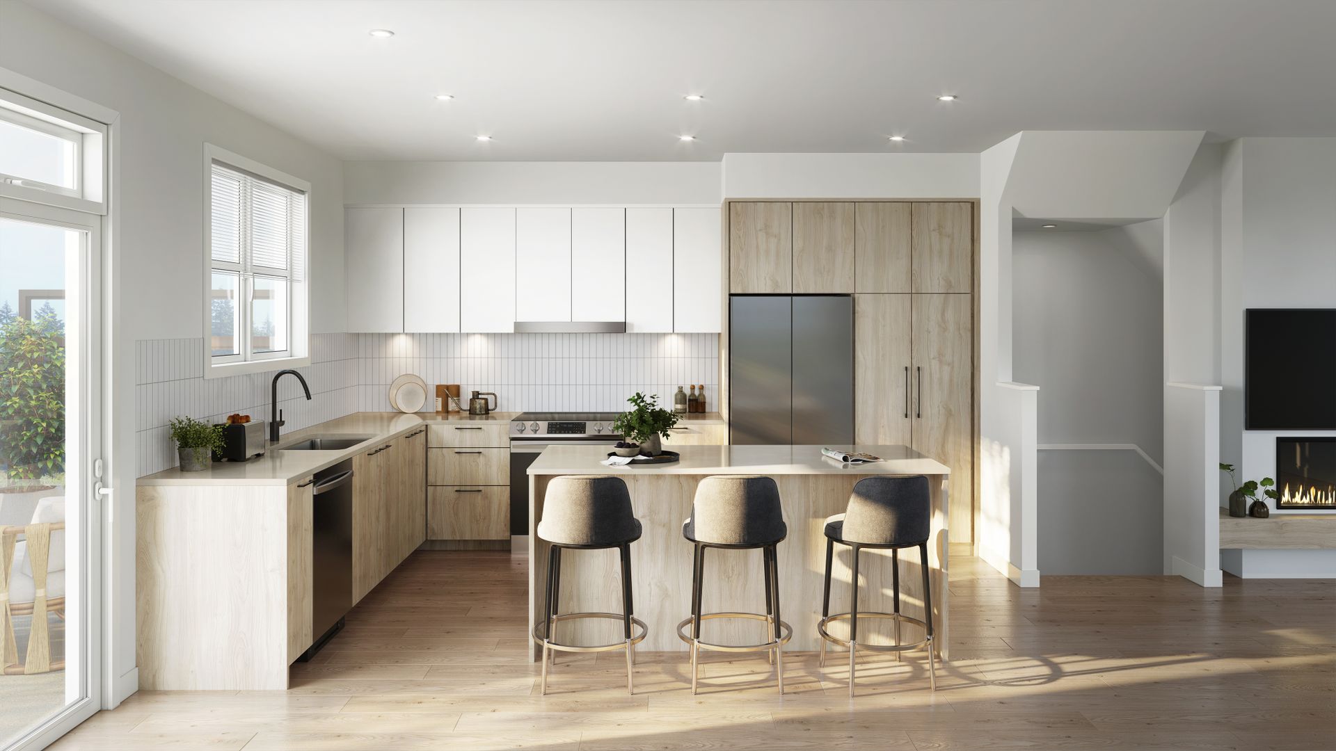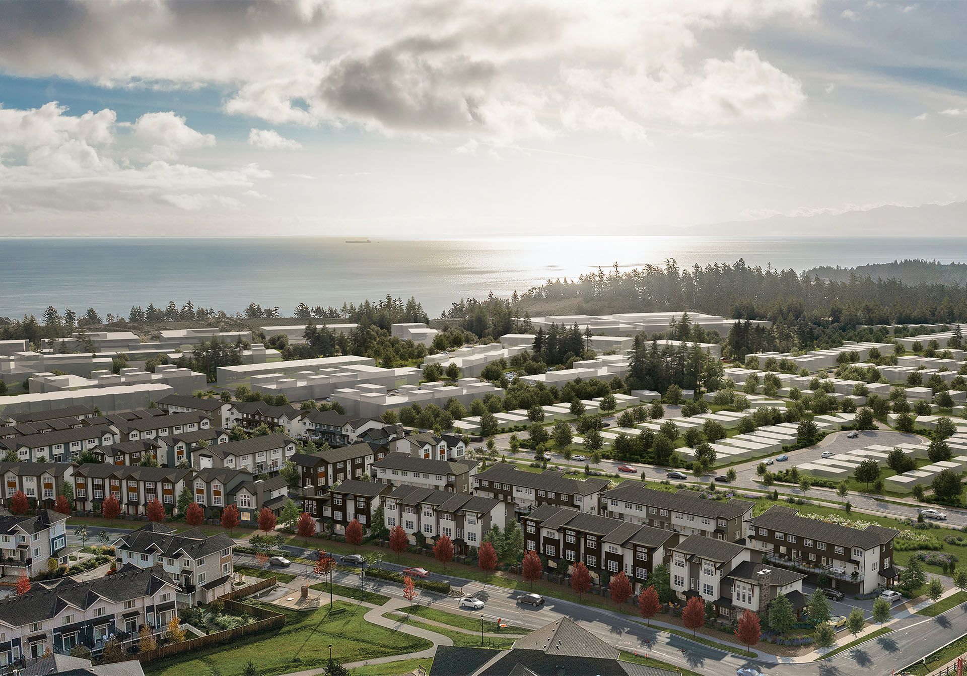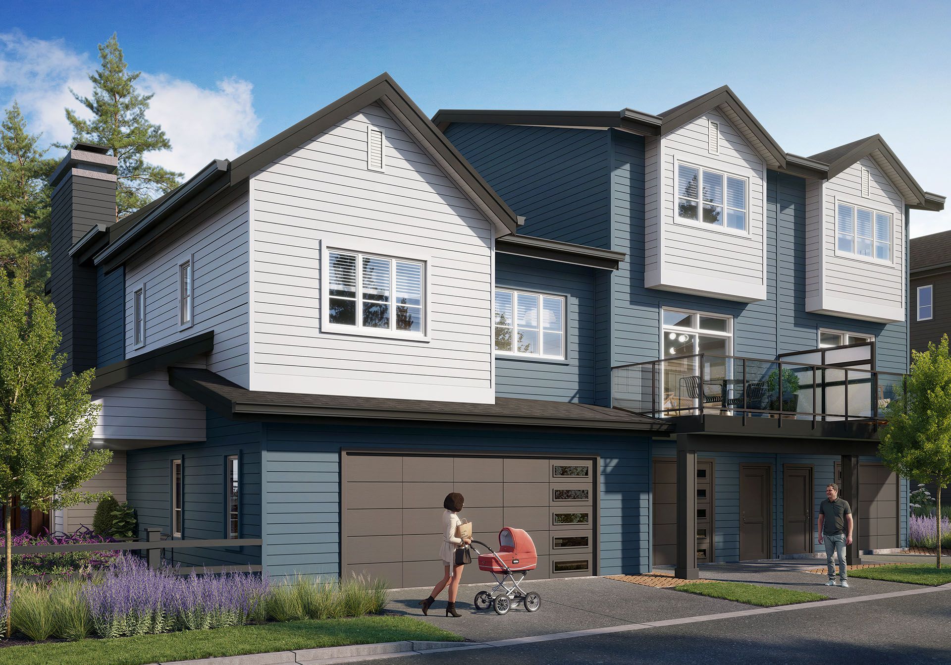 Echo in Colwood by GableCraft Homes comprises 30 woodframe buildings featuring a blend of 2- and 3-story townhomes. These 153 residences showcase a West Coast Contemporary design with a coastal-inspired look, complete with covered front entries and shingle accents.