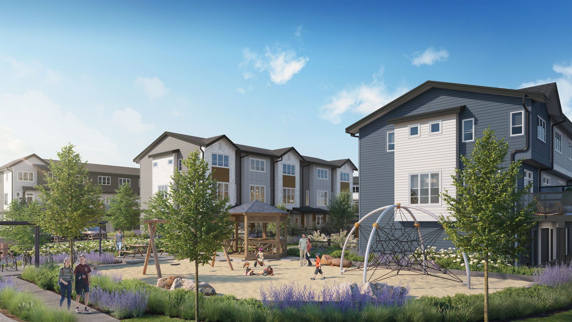 Residents can also enjoy a central outdoor area with picnic tables, a gazebo, a children's play zone, and a versatile lawn.
