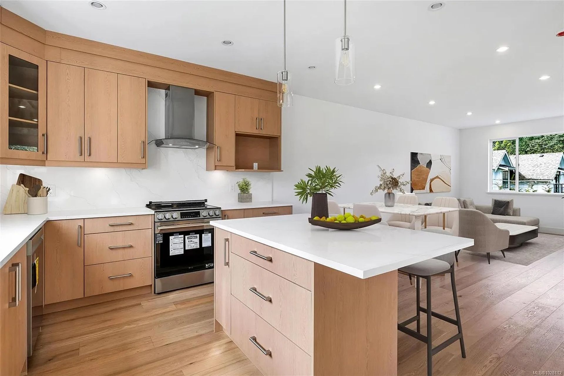The main level features an open concept layout with engineered oak hardwood flooring, quartz countertops, an oversized kitchen island and stainless appliance package. Large windows bring natural light into the living areas, creating bright and comfortable spaces ideal for entertaining or everyday living.